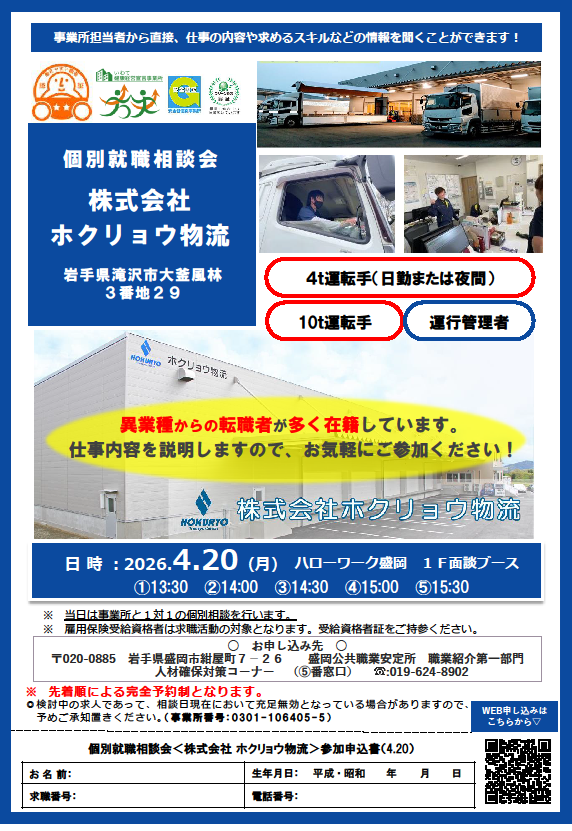 4/20(月)ハローワーク盛岡にて個別就職相談会を実施いたします!